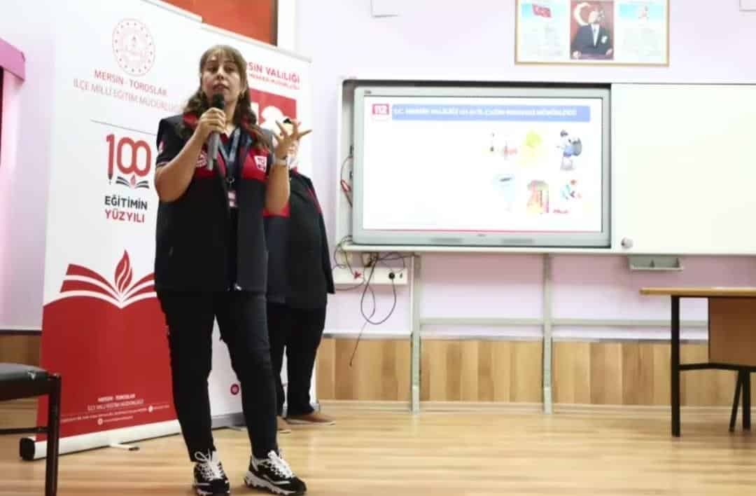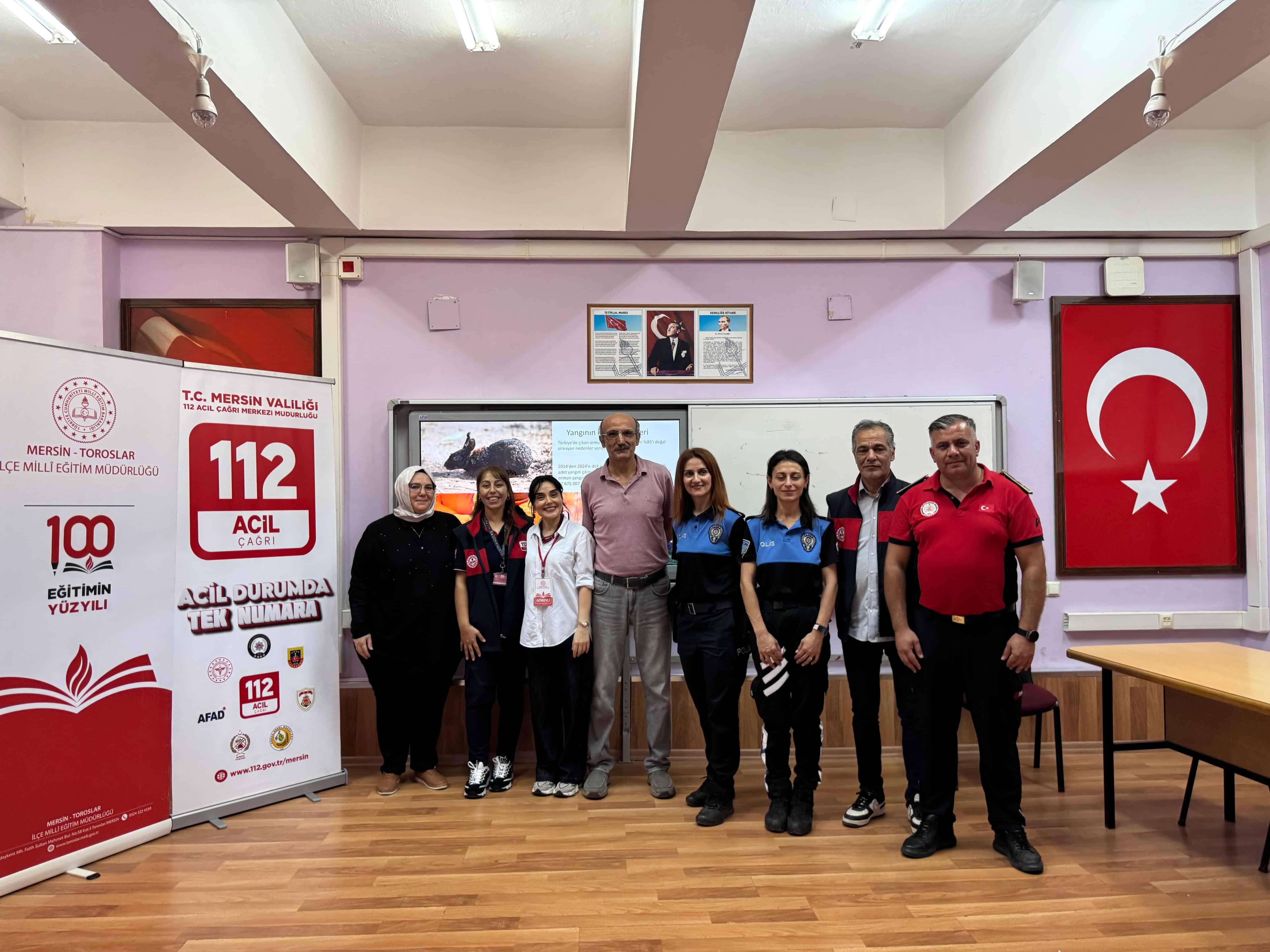 İlçemiz Vali Sabahattin Çakmakoğlu Ortaokulu'nda, Mersin Valiliği 112 Acil Çağrı Merkezi Müdürlüğü tarafından öğrencilere yönelik tanıtım ve bilgilendirme eğitimi gerçekleştirildi.